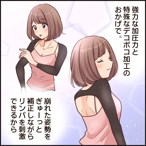 すぐに姿勢が良くなるのがわかります。背筋がピーンと伸びて二の腕はギュッと引き締められるけど、苦しさはない!約4ヶ月経ちますが、肩の角度が直角に変化してきて、横から見た時に肩部分が薄くなったように感じてます!!※画像はイメージです。実際の人物とは異なります。※アンケートハガキから引用